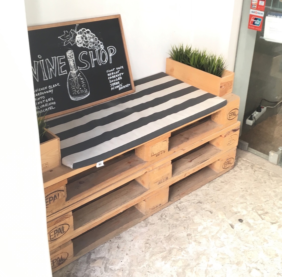 Sur une palette découpée pour créer une banquette d’appoint, on peut utiliser les surmatelas déco à motif, comme ici. Une bien jolie réalisation d’un bar à vin dans les rues de Lisbonne tout près de l’hôtel Vintage dans lequel je séjournais.