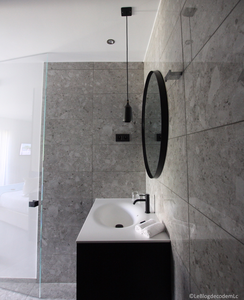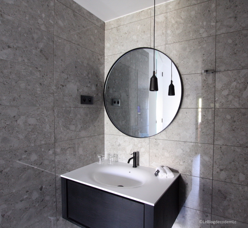 Grand miroir rond cerclé, suspension design et vrai meuble de salle de bain – voui voui, monsieur a chercher les serviettes qui étaient bien rangées dans le tiroir. Mais surtout, on avait ainsi un tiroir pour ranger toutes nos petites affaires. Ce qui est bien agréable plutôt que le grand déballage des produits dans la salle de bain auquel on n’échappe pas habituellement. Et bien entendu, j’ai adoré la petite suspension noire.