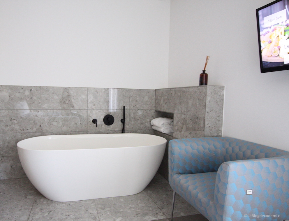Résolument modernes, les chambres sont aménagées comme des suites parentales avec un salon de bain ouvert sur la chambre. Une agréable invitation à la détente et au repos tout en  permettant de converser. Et qu’est-ce-qu’elle est belle cette baignoire !